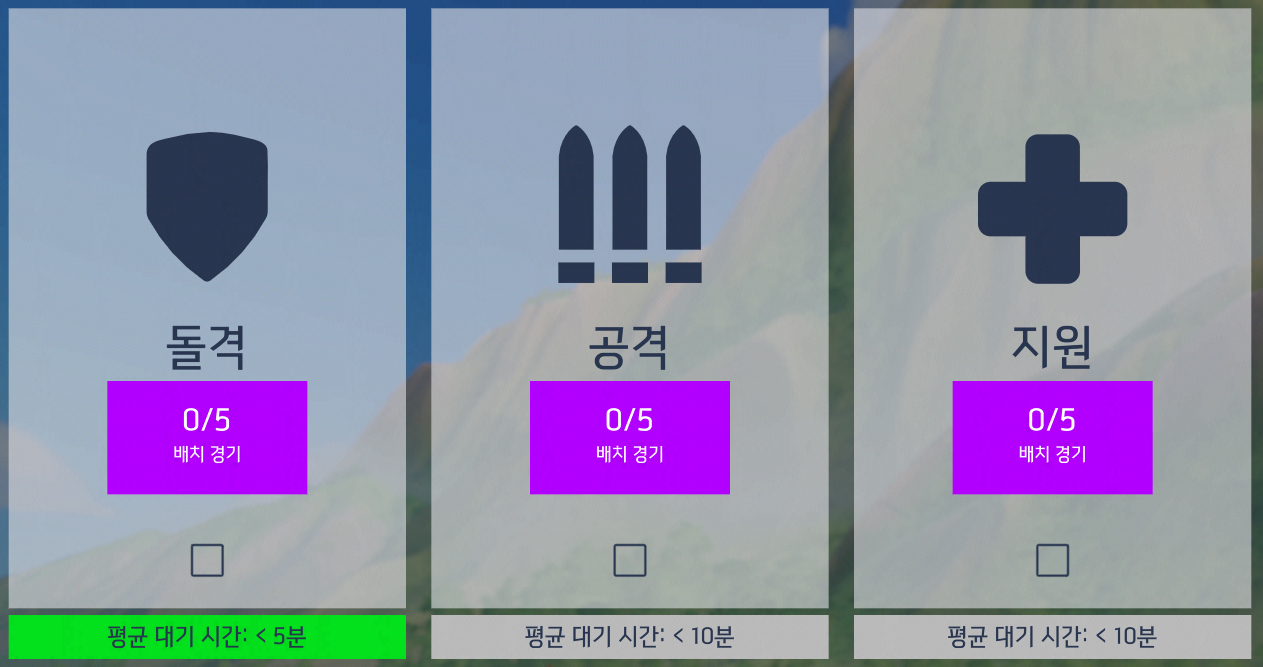플레이어들은 역할 선택 화면에서 각 역할의 추정 대기 시간을 볼 수 있습니다. 지원 영웅은 기다리지 않고 플레이할 수도 있지만, 공격 영웅을 플레이하려면 몇 분간 대기해야 할 수도 있습니다. 이 추정 시간에는 여러 요소가 적용되지만, 보통은 특정 역할에 대기하는 플레이어 수가 반영됩니다. 추정 대기 시간 제공으로 플레이어들이 어떻게 게임을 플레이할지 결정을 내리는 데 도움이 되기를 바랍니다. 또한 플레이어들이 모든 대기열에 고르게 분배되게끔, 활용도가 낮은 역할을 선택하는 플레이어들은 보상을 받습니다.