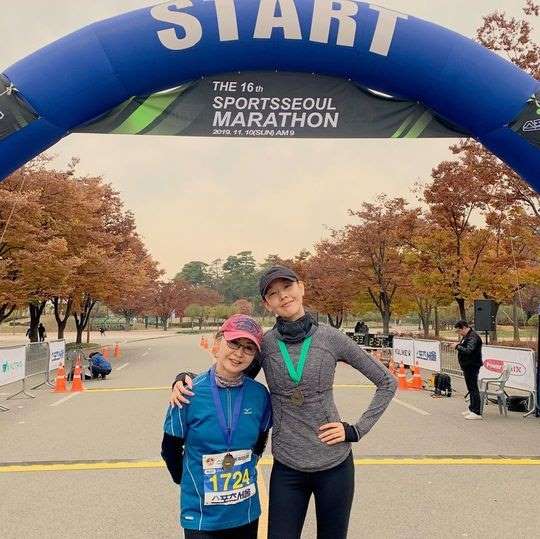 공개된 사진 속 한혜진은 어머니와 함께 마라톤 완주 메달을 목에 건 채 나란히 서있는 모습이 담겨있었습니다.